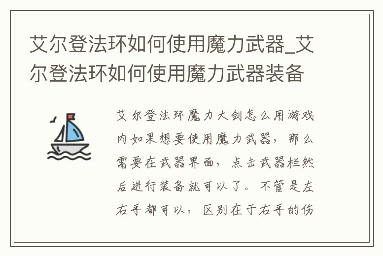 艾爾登法環魔力大劍怎么用游戲內如果想要使用魔力武器,那么需要在武器界面,點擊武器欄然后進行裝備就可以了。不管是左右手都可以,區別在于右手的傷害會更高一點,通常情況下法師是右手魔力武器,戰士是左手魔力武器。然后通過按鍵盤上面的←→按鍵進行切。2、艾爾登法環怎么裝備魔法進入艾爾登法環游戲