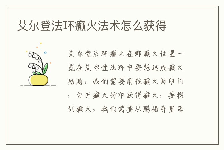 艾爾登法環癲火在哪癲火位置一覽在艾爾登法環中要想達成癲火結局,我們需要前往癲火封印門,打開癲火封印獲得癲火,要找到癲火,我們需要從賜福棄置惡兆的大教堂出發,攻擊寶箱后的墻壁打開隱藏道路,然后一路向下玩跳跳樂,最終到達癲火門前,脫干凈衣服進。1、艾爾登法環癲火圣印記在哪癲火圣印記獲得