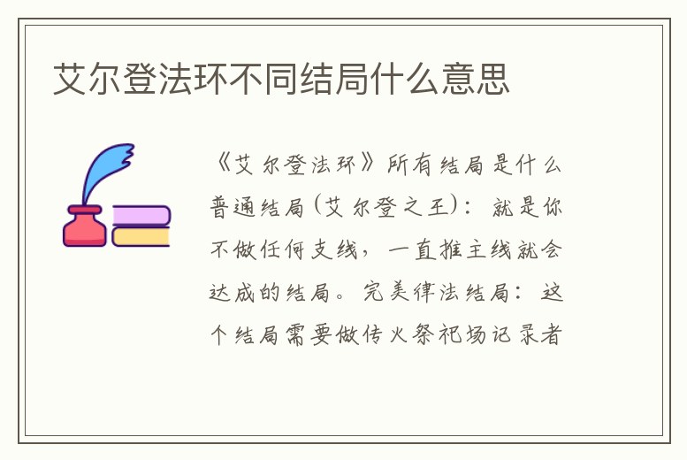 艾爾登法環結局是玩家成為新的艾爾登之王,開啟又一個輪回。普通結局艾爾登之王,就是你不做任何支線,一直推主線就會達成的結局,完美律法結局這個結局需要做傳火祭祀場記錄者就是信仰老師與金面具的支線。癲火結局這個。