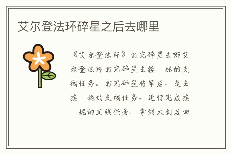 《艾爾登法環》打完碎星去哪艾爾登法環打完碎星去接菈妮的支線任務。打完碎星將軍后,是去接菈妮的支線任務,進行完成接菈妮的支線任務。拿到大劍后回到魔女塔會觸發狼人變紅名的事件,殺了并不會影響,并且魔法師塞爾維斯也