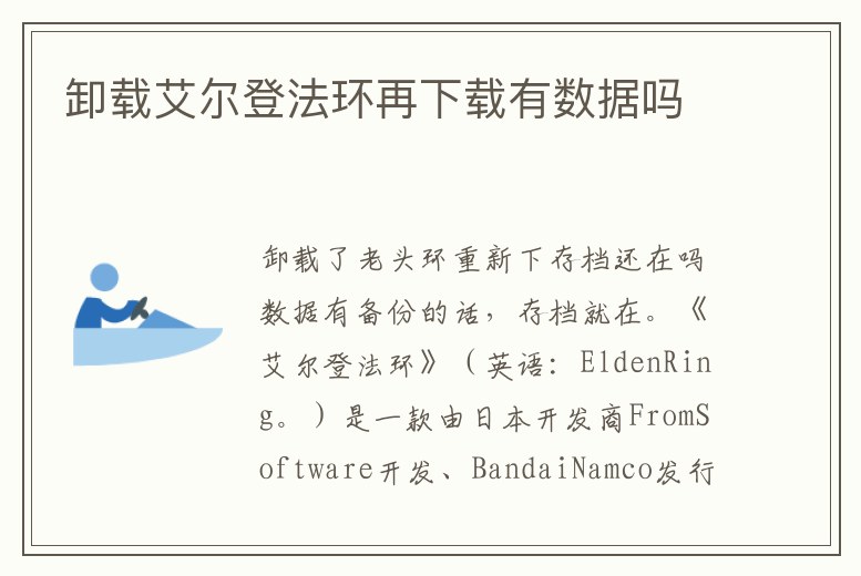 數據有備份的話,存檔就在。《艾爾登法環》(英語:Elden Ring。)是一款由日本開發商From Software開發、Bandai Namco發行的黑暗幻想風格動作角色扮演游戲。于2022年2月25日于Steam、Microsoft Windows、PlayStation PlaySt。