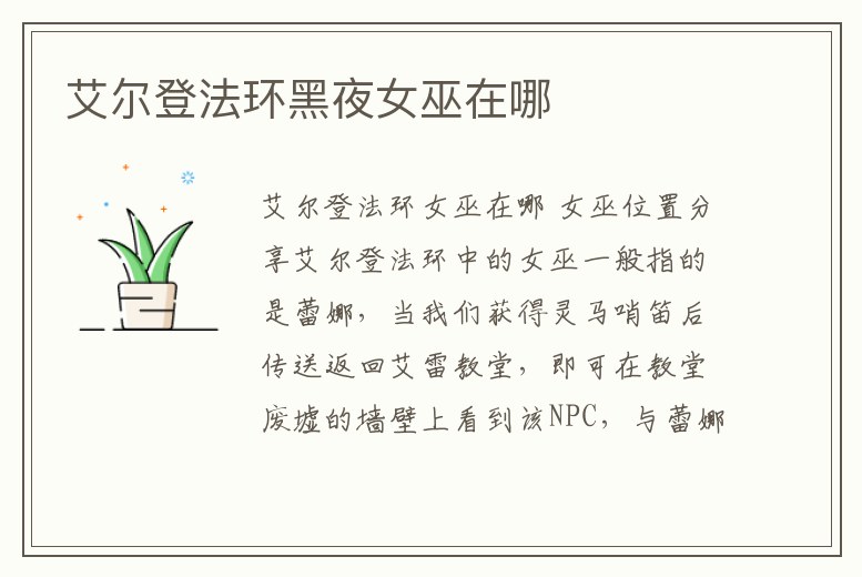 艾爾登法環中的女巫一般指的是蕾娜,當我們獲得靈馬哨笛后傳送返回艾雷教堂,即可在教堂廢墟的墻壁上看到該NPC,與蕾娜交談可以獲得用于召喚骨灰的招魂鈴和離群野狼的骨灰。女巫位置分享 當我們獲得靈馬哨笛后傳送返回艾雷。