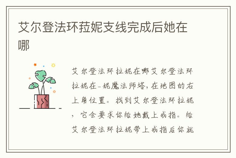 艾爾登法環拉妮在_妮魔法師塔,在地圖的右上角位置。找到艾爾登法環拉妮,它會要求你給她戴上戒指。給艾爾登法環拉妮帶上戒指后你就會獲得暗月大劍。《艾爾登法環》(英語:EldenRing)是一款由日本開發商FromSoftware開。