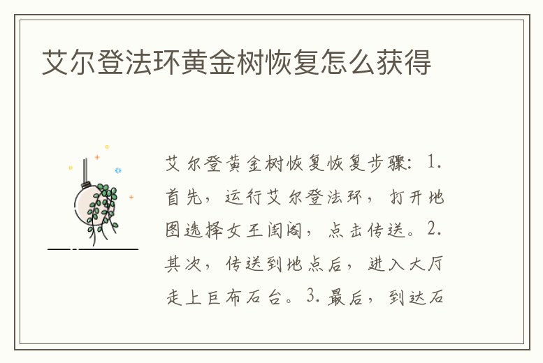 老頭環黃金樹恢復沒了可以在燒樹后的灰城羅德爾到女王閨閣旁撿取。黃金樹恢復是艾爾登法環中的一個禱告,能夠幫助我們恢復血量。