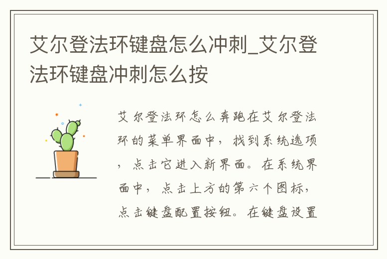 在艾爾登法環的菜單界面中,找到系統選項,點擊它進入新界面。在系統界面中,點擊上方的第六個圖標,點擊鍵盤配置按鈕。在鍵盤設置界面里,找到沖刺一欄,即可設置沖刺按鈕,回到主界面,長按沖刺按鈕,即可進行奔跑。