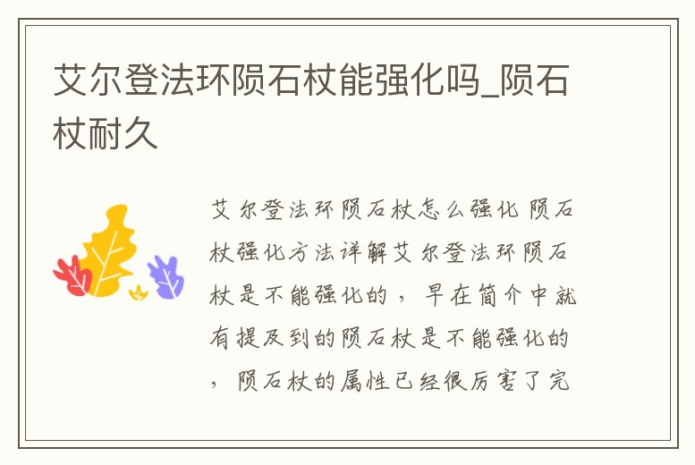 艾爾登法環隕石杖不能強化。游戲當中的隕石杖是無法進行強化的,這把武器其實算是游戲設計師給法師設計的過渡新手武器,避免前期開荒過于艱難。艾爾登法環簡介 故事發生在名為交界地的地方,這里的人們擁戴永恒女王瑪麗卡。也。