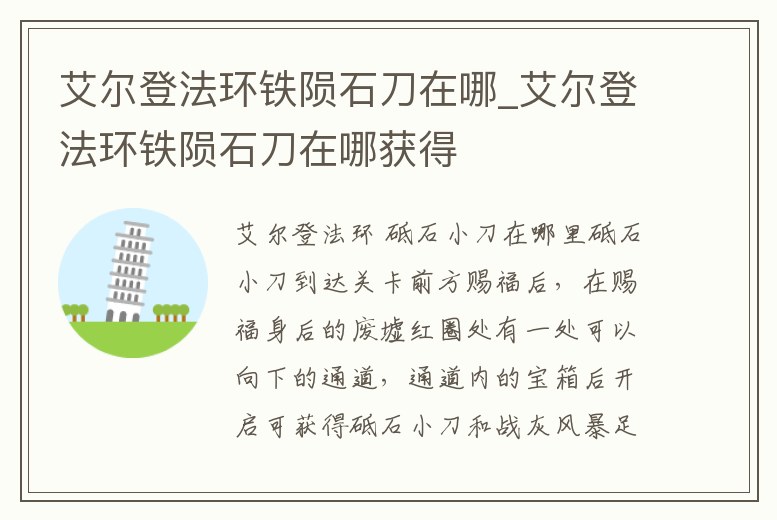 關卡前廢墟砥石小刀這玩意兒就在關卡前廢墟里面(第一次遇到梅琳娜的那個賜福旁邊就是),就是有好幾個王國騎士守著的地方,仔細探索一下就能看到一個地下入口,進入之后開門開寶箱,寶箱里面就是砥石小刀。
