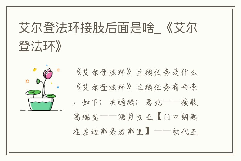 《艾爾登法環》主線任務有兩條,如下:共通線:惡兆——接肢葛瑞克——滿月女王【門口鑰匙在左邊那條龍那里】——初代王靈體——惡兆王——火焰巨人【打完可停下做支線】。癲火之王線:開啟食糞者干線——抵達。
