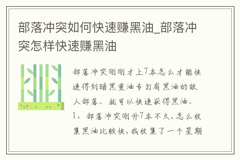 部落沖突剛剛才上7本怎么才能快速得到暗黑重油專打有黑油的敵人部落。就可以快速獲得黑油。1、部落沖突剛升7本不久,怎么收集黑油比較快,我收集了一個星期才3000多,感明確目標:專門來搶黑油的,看到其他的什么東西就不要想了,也不要去搶。黑油