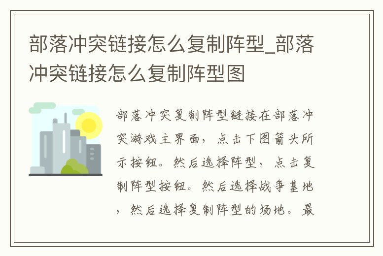 在部落沖突游戲主界面,點擊下圖箭頭所示按鈕。然后選擇陣型,點擊復制陣型按鈕。然后選擇戰爭基地,然后選擇復制陣型的場地。最后選擇合適的區域,即可復制陣容鏈接了。