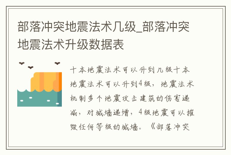 十本地震法術可以升到4級,地震法術機制多個地震攻擊建筑的傷害遞減,對城墻遞增,4級地震可以摧毀任何等級的城墻。《部落沖突》是由芬蘭游戲公司SupercellOy開發的一款塔防類的策略手游,該作于2015年9月24日正式公測。游戲攻略。