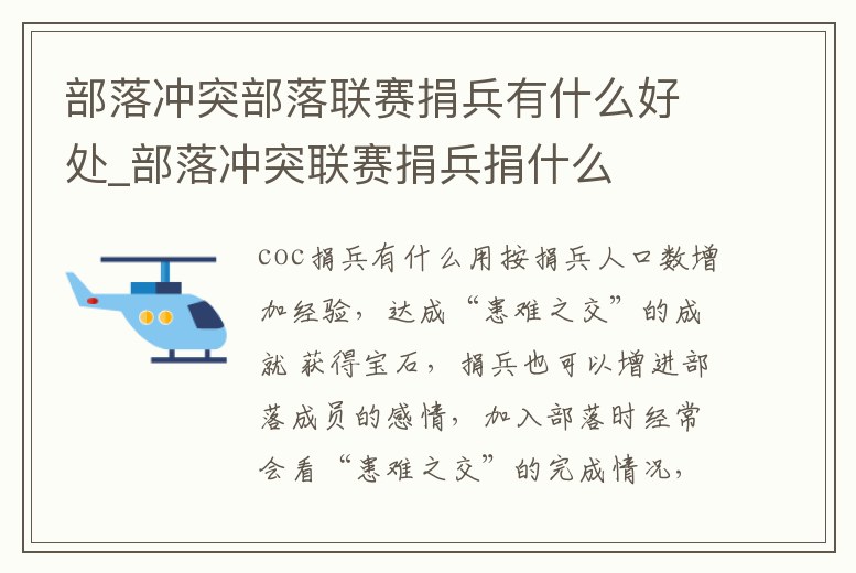 捐兵唯一微不足道的好處可能就是任務列表里一個捐兵25000給250寶石的任務了,捐兵都是互幫互利的,相互之間捐兵,增加實力,增厚感情,所以加入一個能積極捐兵的部落,會很愉快,也會發展更快!當然捐兵還能獲得一定經驗。
