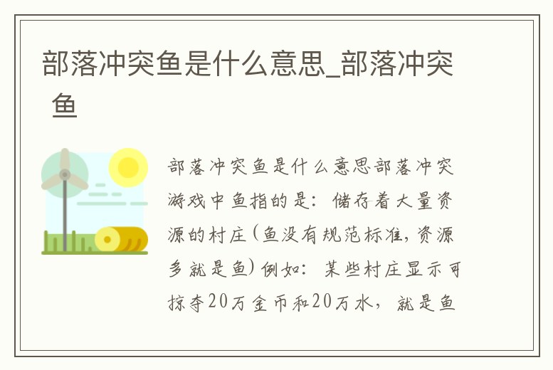 部落沖突游戲中魚指的是:儲存著大量資源的村莊(魚沒有規范標準,資源多就是魚)例如:某些村莊顯示可掠奪20萬金幣和20萬水,就是魚 。