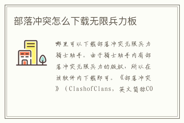 騎士助手。由于騎士助手內有部落沖突無限兵力的版權,所以在該軟件內下載即可。《部落沖突》(ClashofClans,英文簡稱COC)是由芬蘭游戲公司SupercellOy開發的一款塔防類的策略手游。