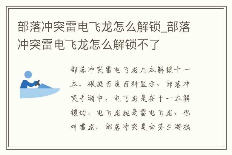 十一本。根據(jù)百度百科顯示,部落沖突手游中,電飛龍是在十一本解鎖的。電飛龍就是雷電飛龍,也叫雷龍。部落沖突是由芬蘭游戲公司SupercellOy開發(fā)的一款塔防類的策略手游,講述了各部落為了爭(zhēng)奪資源和土地,進(jìn)行了無數(shù)次的戰(zhàn)斗的。