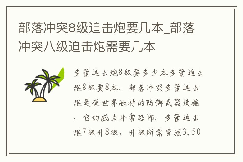 多管迫擊炮8級要8本。部落沖突多管迫擊炮是夜世界獨特的防御武器設施,它的威力非常恐怖。多管迫擊炮7級升8級,升級所需資源3,500,000金幣,升級時間5天。基本屬性:射程4-13格,攻擊速度5秒,傷害類型區域濺射,攻擊單位。