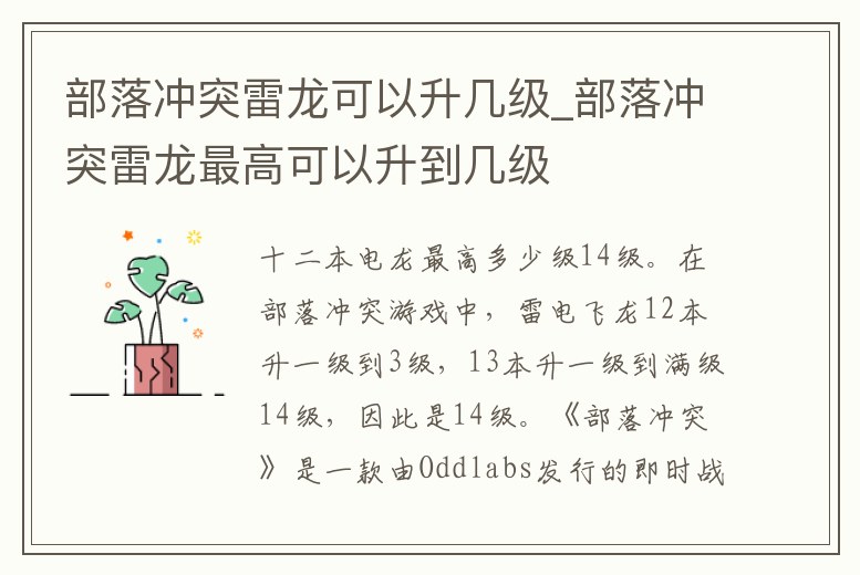14級。在部落沖突游戲中,雷電飛龍12本升一級到3級,13本升一級到滿級14級,因此是14級。《部落沖突》是一款由Oddlabs發行的即時戰略游戲,類似《上帝也瘋狂》的全三維Q版的卡通風格,主要講述古代原始部族之間的瓜葛糾紛。