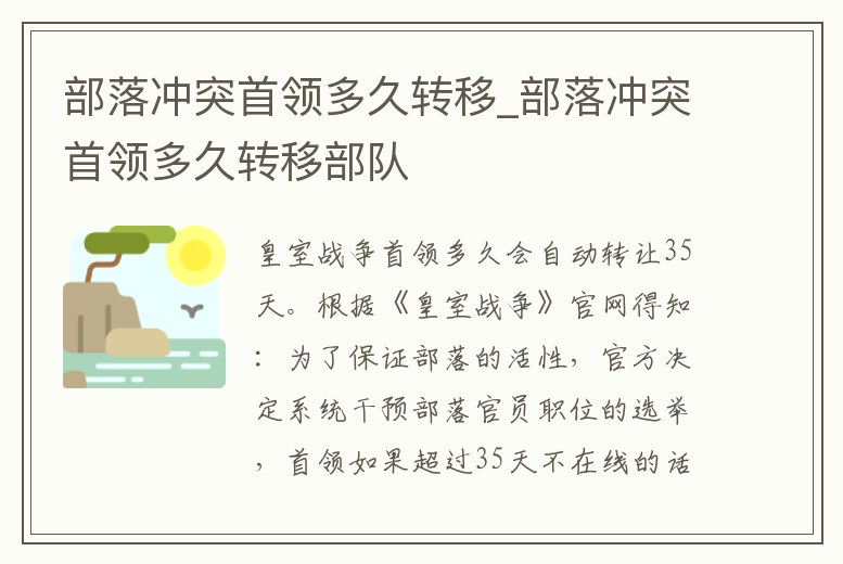 35天。根據《皇室戰爭》官網得知:為了保證部落的活性,官方決定系統干預部落官員職位的選舉,首領如果超過35天不在線的話,會自動讓位給最近在線時間最長的副首領,如果沒有副首領則會讓位給長老。首領會在即將退位的14天與第。