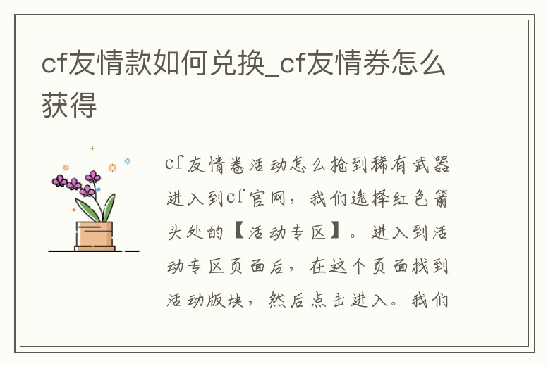 cf友情卷活動怎么搶到稀有武器進入到cf官網,我們選擇紅色箭頭處的【活動專區(qū)】。進入到活動專區(qū)頁面后,在這個頁面找到活動版塊,然后點擊進入。我們在這個頁面選擇【召喚新老戰(zhàn)友領永久】點擊進入即可?;瑒禹撁?,點擊【分享給qq好友】或者其。1、cf兌
