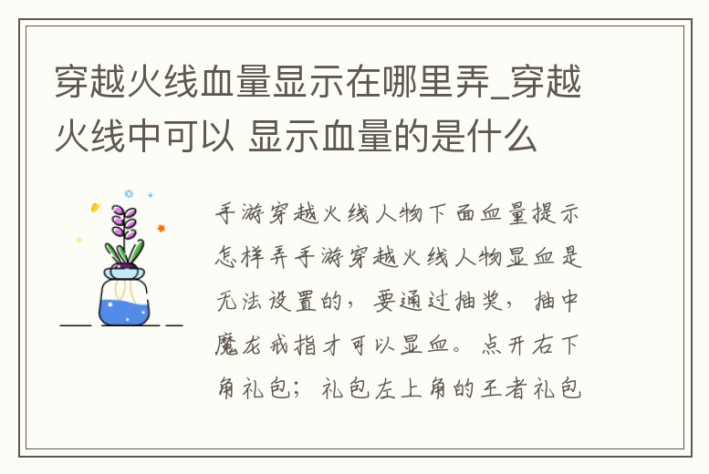 手游穿越火線人物顯血是無法設置的,要通過抽獎,抽中魔龍戒指才可以顯血。點開右下角禮包;禮包左上角的王者禮包中有一個魔龍戒指;抽中魔龍戒指后進行洗練即可。