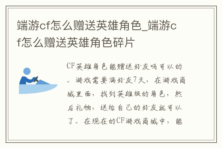可以的。游戲需要滿好友7天,在游戲商城里面,找到英雄級的角色,然后禮物,送給自己的好友就可以了。在現在的CF游戲商城中,能夠看到的英雄級角色只有五個,到目前為止,只有“蝴蝶”這個英雄角色不能以CF點來購買,其余的都。