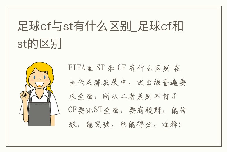 ST 叫做突前前鋒 CF 叫做 二前鋒 兩者有什么差別呢 在當代足球發展中,攻擊線普遍要求全面,所以二者差別不打了 CF要比ST全面,要有視野,能傳球,能突破,也能得分。注釋:其次,中鋒不一定站在最。