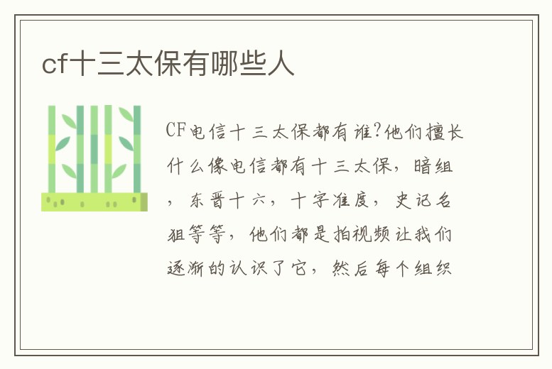CF電信十三太保都有誰?他們擅長什么像電信都有十三太保,暗組,東晉十六,十字準度,史記名狙等等,他們都是拍視頻讓我們逐漸的認識了它,然后每個組織都說自己是電信第一,每天叫囂著滅那個,滅這個。1、十三太保是哪些人十三、十三太保李存孝李克用養(yǎng)子,與