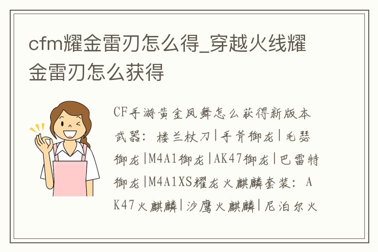 CF手游黃金鳳舞怎么獲得新版本武器:樓蘭杖刀|手斧御龍|毛瑟御龍|M4A1御龍|AK47御龍|巴雷特御龍|M4A1XS耀龍火麒麟套裝:AK47火麒麟|沙鷹火麒麟|尼泊爾火麒麟黃金武器:黃金雷刃|耀金雷刃黃金鳳舞屬性:威力:73便攜:。1、cf端游有耀金雷刃嗎耀金雷刃的外觀非常引人注目,擁有一把晶瑩剔透