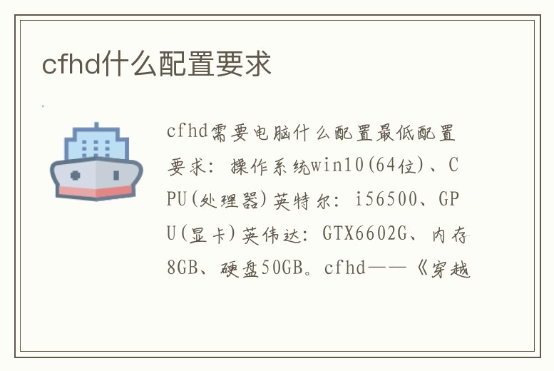 cfhd需要電腦什么配置最低配置要求:操作系統win10(64位)、CPU(處理器)英特爾:i56500、GPU(顯卡)英偉達:GTX6602G、內存8GB、硬盤50GB。cfhd——《穿越火線高清競技大區》是由Smliegate,Remedy開發,由深圳市騰訊計算機系統有限公。1、《cf》hd配置要求是什么6G以上內存、GTX660或HD7850獨立顯卡,推薦配置要求七代酷睿I5760