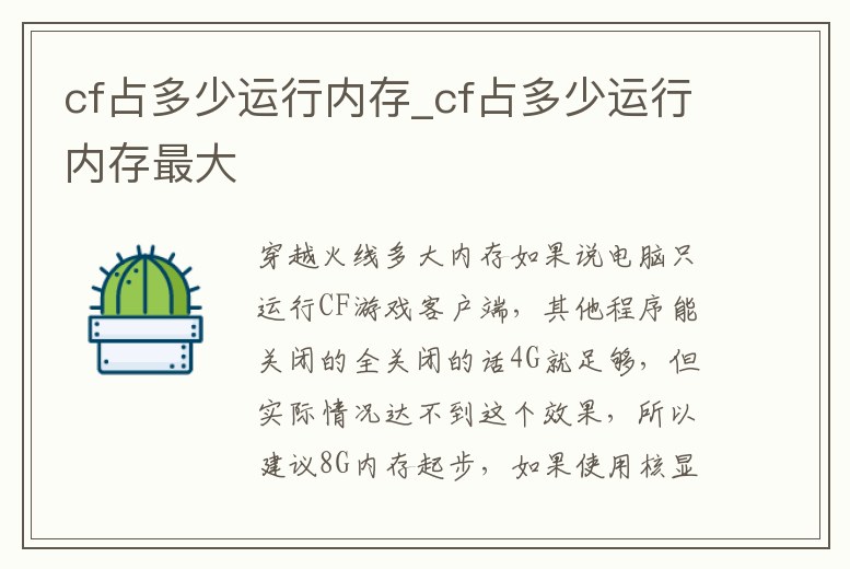 穿越火線多大內存如果說電腦只運行CF游戲客戶端,其他程序能關閉的全關閉的話4G就足夠,但實際情況達不到這個效果,所以建議8G內存起步,如果使用核顯玩的話最好上兩張8G內存,組一個雙通道,效果會更好。2、穿越火線多少個g內存穿越火線端游大小有15G左