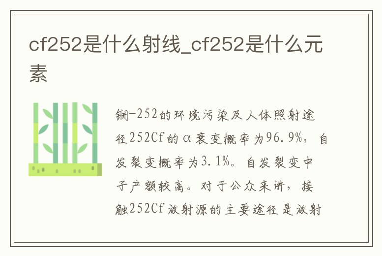 網友分享:锎-252核素的重要特征是自發裂變放出大量中子,同時伴隨放出?粒子和?射線。半衰期為2.64年,中子產額為2.35?1012中子/秒·克锎-252,中子平均能量為2.348兆電子伏,其?能量大約為6兆電子。