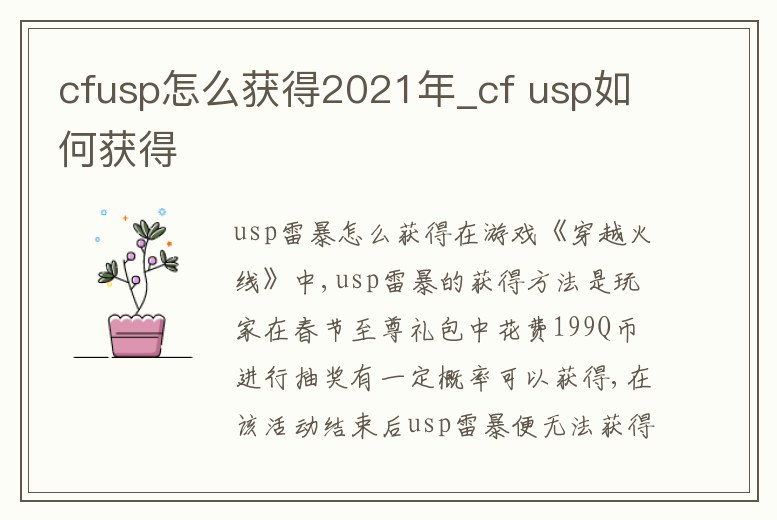 usp雷暴怎么獲得在游戲《穿越火線》中,usp雷暴的獲得方法是玩家在春節至尊禮包中花費199Q幣進行抽獎有一定概率可以獲得,在該活動結束后usp雷暴便無法獲得,只能等待其他活動上線或返場。我使用了幾天,這么說吧,你要喜歡槍的外觀加上你有點錢,1、新usp槍王排位獎勵怎么領取首先打開《穿越火線》游戲,進入游戲主界面。其次在游戲主界面的右下角找到郵件并點擊,會