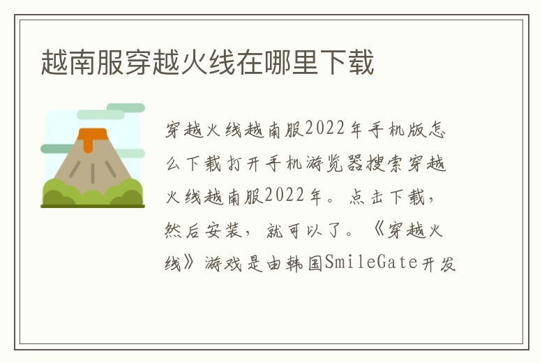 打開手機游覽器搜索穿越火線越南服2022年。點擊下載,然后安裝,就可以了?!洞┰交鹁€》游戲是由韓國SmileGate開發,由深圳市騰訊計算機系統有限公司代理運營的一款第一人稱射擊游戲。