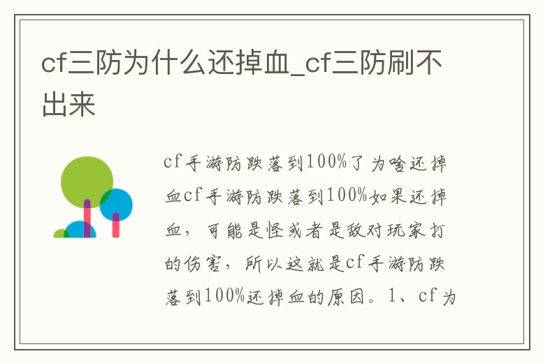 cf手游防跌落到100%了為啥還掉血cf手游防跌落到100%如果還掉血,可能是怪或者是敵對玩家打的傷害,所以這就是cf手游防跌落到100%還掉血的原因。1、cf為啥總掉血網友分享:機甲或怪到了第一層,也就是你一進去就中毒的那一層,雷霆塔會超負荷,然