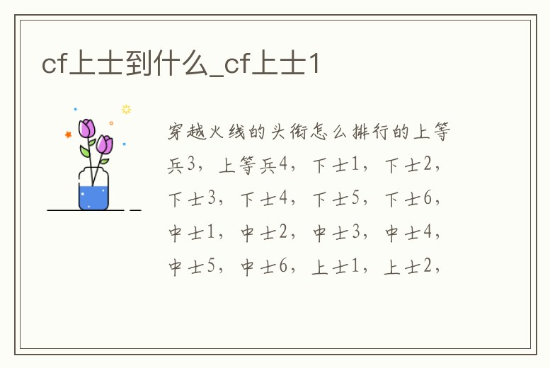 穿越火線的頭銜怎么排行的上等兵3,上等兵4,下士1,下士2,下士3,下士4,下士5,下士6,中士1,中士2,中士3,中士4,中士5,中士6,上士1,上士2,上士3,上士4,上士5,上士6,少尉1。1、cf上士過后是什