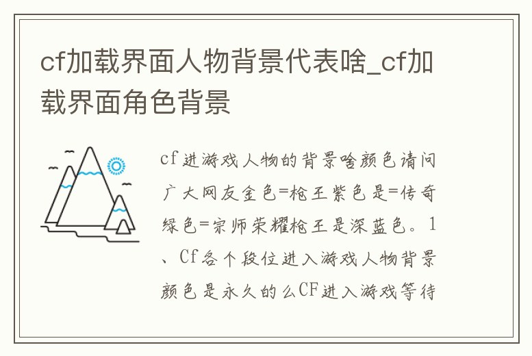 cf進游戲人物的背景啥顏色請問廣大網友金色=槍王紫色是=傳奇綠色=宗師榮耀槍王是深藍色。1、Cf各個段位進入游戲人物背景顏色是永久的么CF進入游戲等待界面的個人框顏色,是根據該賬號在上一賽季的段位所分配的。也就是說,假設你上一個賽季是專家段位,本賽季就會得到黃色的框;本賽季你是大師段位,下賽季就會得到藍色框。綜上所述,進入