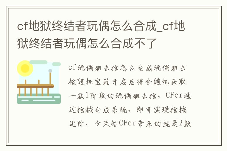 cf玩偶狙擊槍怎么合成玩偶狙擊槍隨機寶箱開啟后將會隨機獲取一款1階段的玩偶狙擊槍,CFer通過槍械合成系統(tǒng),即可實現(xiàn)槍械進階,今天給CFer帶來的就是2款3階段玩偶狙擊槍:Barrett-戰(zhàn)龍-靈狐者&M200-赤血龍魂-靈狐者。Barrett-戰(zhàn)龍-靈狐者:采用CF。1、穿越火線地獄終結(jié)者怎么變,摁哪個健啊在對局中被系統(tǒng)選擇為終結(jié)者。操控終結(jié)