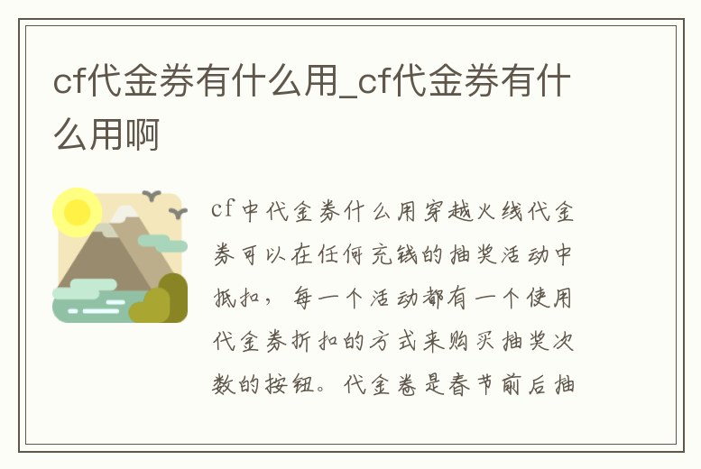 擁有代金券的玩家,只需要在充值時勾選使用代金券就可以了。一次最多抵扣9個代金券,代金券一旦使用后無法退還。《穿越火線》簡稱CF,是由SmileGate開發(fā),中國內(nèi)地由騰訊游戲代理運營的一款第一人稱射擊游戲。