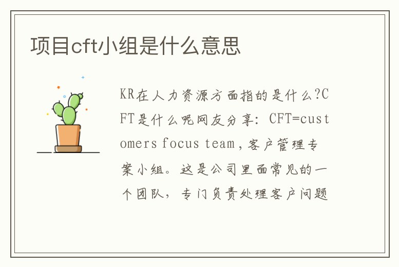 網友分享:CFT=customers focus team ,客戶管理專案小組。這是公司里面常見的一個團隊,專門負責處理客戶問題。CFT 人力發展機構所倡導的管理理念和文化內涵 。