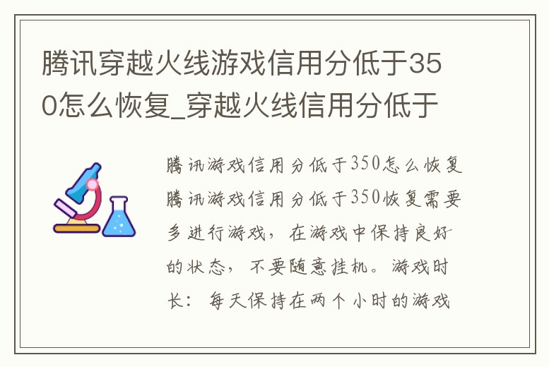 騰訊游戲信用分低于350恢復需要多進行游戲,在游戲中保持良好的狀態,不要隨意掛機。游戲時長:每天保持在兩個小時的游戲,后臺會默認您是屬于高質量的優質玩家,同時也會給您進行加分。舉報其他玩家:當然不是隨便舉報。