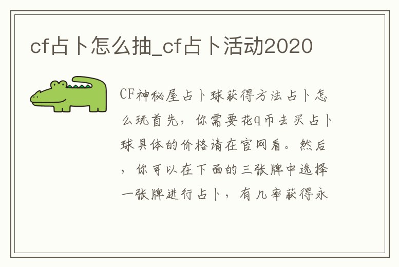 首先,你需要花q幣去買占卜球 具體的價格請在官網看。然后,你可以在下面的三張牌中選擇一張牌進行占卜,有幾率獲得永久的獎勵。抽到了某件道具時,可以選擇讓它在游戲中使用,也可以將它換成cf點。但是,抽到永久的概率。