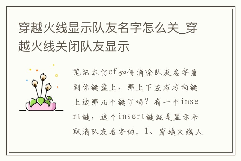 一般的筆記本按insert鍵。按一下顯示隊友名字,再按一下顯示隊友距你的距離。《穿越火線》(CrossFire,簡稱CF)是由韓國笑門娛樂(Smile Gate)開發(fā),中國內(nèi)地由騰訊游戲代理運營的一款第一人稱射擊游戲。游戲講述了全球兩大。