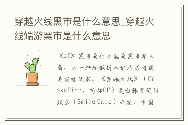 就是黑市軍火商,以一種超低折扣的方式將道具賣給玩家?!洞┰交鹁€》(CrossFire,簡稱CF)是由韓國笑門娛樂(Smile Gate)開發,中國內地由騰訊游戲代理運營的一款第一人稱射擊游戲。游戲講述了全球兩大傭兵集團Global Risk和Bl。