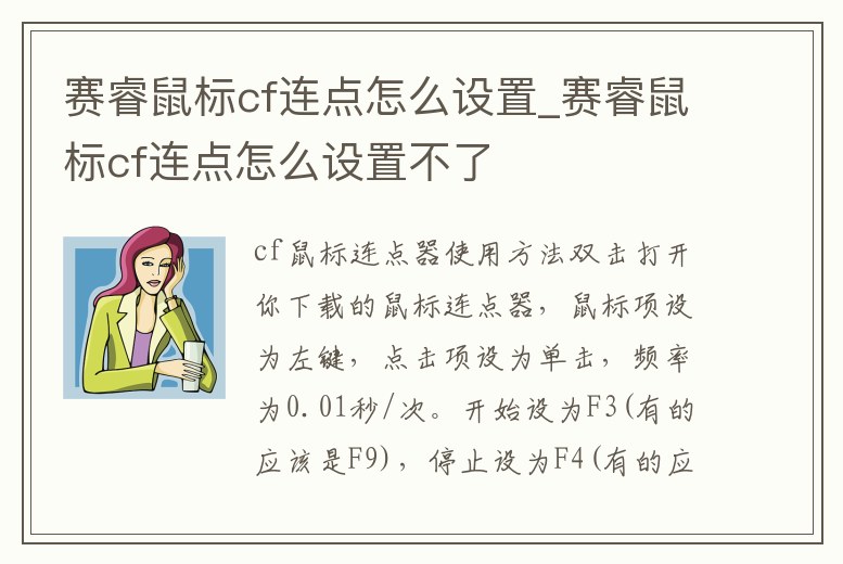 CF鼠標連點器怎么設置?1.運行本程序 2.運行游戲 3.把鼠標放在你想點擊的地方 4.按Ctrl+F3啟動鼠標自動點擊 5.完成目的后,按再次按Ctrl+F3停止鼠標自動點擊!注:Ctrl+F3為本程序默認的熱鍵 我還不辭辛勞上網找了網友說。
