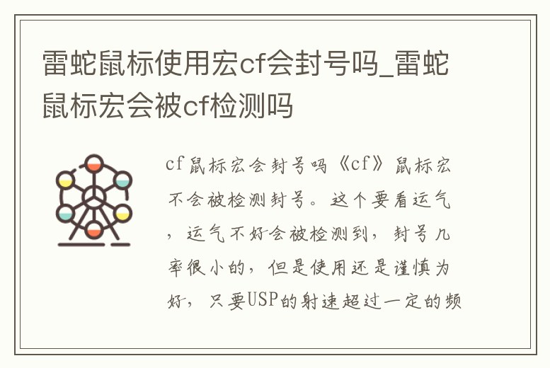 《cf》鼠標宏不會被檢測封號。這個要看運氣,運氣不好會被檢測到,封號幾率很小的,但是使用還是謹慎為好,只要USP的射速超過一定的頻率,就會被客戶端踢下線,且一個小時內不得登陸,如果持續使用,很可能就會被封禁,一石。