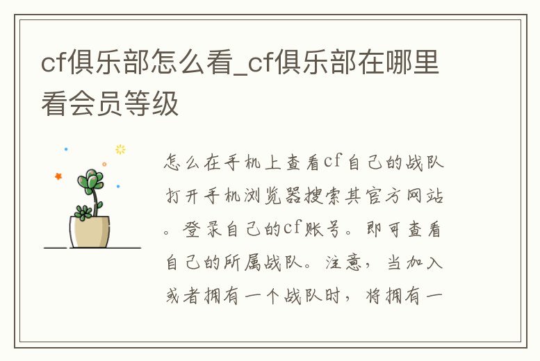 打開手機(jī)瀏覽器搜索其官方網(wǎng)站。登錄自己的cf賬號(hào)。即可查看自己的所屬戰(zhàn)隊(duì)。注意,當(dāng)加入或者擁有一個(gè)戰(zhàn)隊(duì)時(shí),將擁有一個(gè)獨(dú)立的聊天室,即戰(zhàn)隊(duì)聊天。只有同戰(zhàn)隊(duì)的人員才能在一起聊天,只有有著共同性格的伙伴,有。