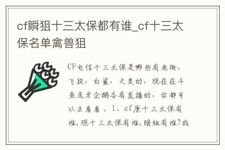 cf十三太保有禽獸狙。曾被稱為電信一區“十三太保”的禽獸狙是原湖南百城冠軍SK戰隊的隊長,創下過個人競技中巴雷特187殺的記錄,憑借過人的意識與犀利的槍法為眾人所熟知。少年成名的禽獸狙,在打CF時風格與他的性格也十分。