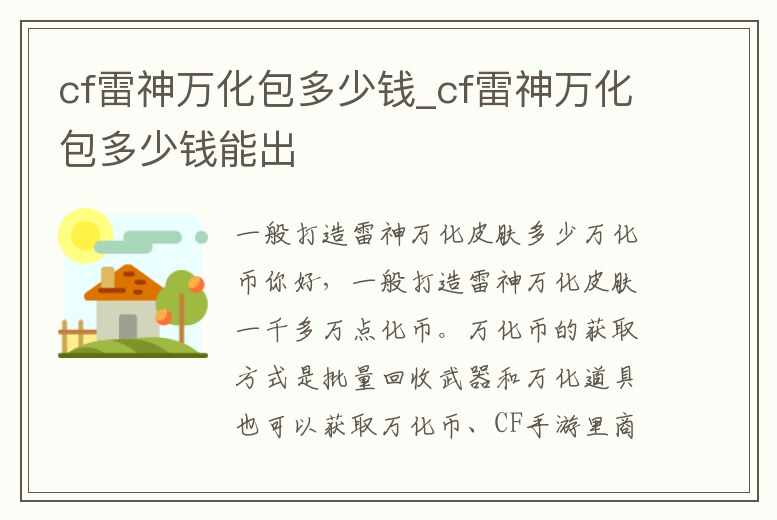 你好,一般打造雷神萬化皮膚一千多萬點化幣。萬化幣的獲取方式是批量回收武器和萬化道具也可以獲取萬化幣、CF手游里商城會不定期開放萬化幣直購或者在游戲中打造等級提升獎勵萬化幣。