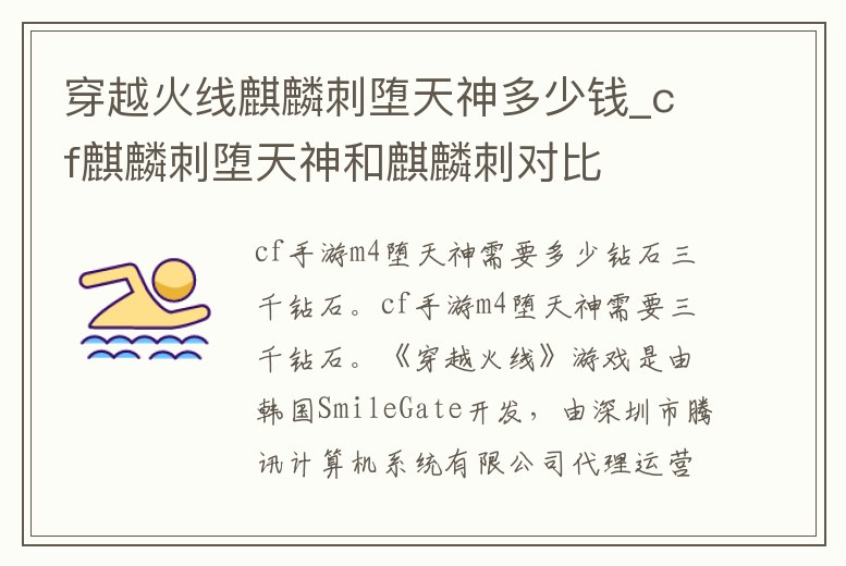三千鉆石。cf手游m4墮天神需要三千鉆石。《穿越火線》游戲是由韓國SmileGate開發,由深圳市騰訊計算機系統有限公司代理運營的一款第一人稱射擊游戲。