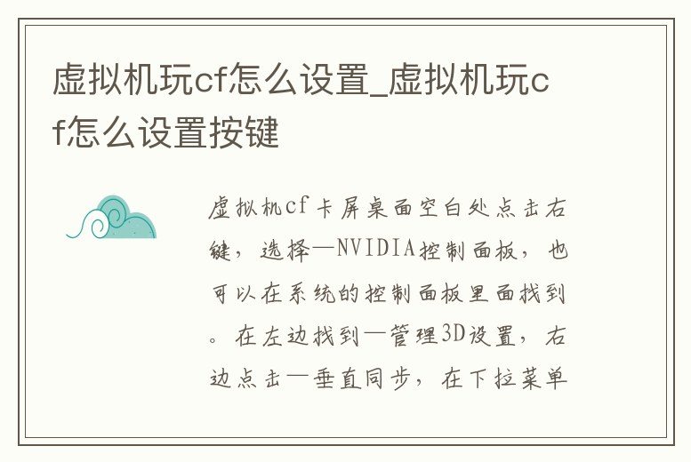 桌面空白處點擊右鍵,選擇—NVIDIA控制面板,也可以在系統的控制面板里面找到。在左邊找到—管理3D設置,右邊點擊—垂直同步,在下拉菜單中選擇—關閉。關閉垂直同步后可能游戲會出現有鋸條等情況。繼續剛才的窗口,下。